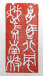 縦横・5×2.4cm 「古詩十九首」の一節を、古璽文で刻した「胡馬北風越鳥 南枝」(胡馬は北風、越鳥は南枝)である。故郷を懐かし む望郷の念を表した言葉である。古詩には、「道路は阻り て長く、會面安んぞ知る可けん、胡馬は北風に依り、越鳥 は南枝に巣くふ」と有る。己もスーパーで田舎の野焼きを 見かけると、無意識に賈い求めてしまう。野焼きよりも「が んす」が食べたいのだが、東京では賣っていない。 |