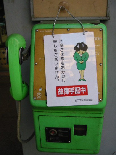 The public pay phone is broken. That in itself is quite amazing and well worth a photo. But what really clinched it for me was the sign they have put up apologizing for the 'great inconvenience' caused by this faulty phone. The figure bowing humbly seeking to assuage our ire is (surprise! surprise!) a woman. As is well documented, the vast majority of the technical staff working for the telephone companies is female, and so it makes sense, doesn't it?