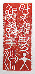 縦横・5×2.1cm 『詩經』大雅旱麓の一句を、金文で刻した「鳶飛戻天魚 躍于淵」(鳶は飛びて天に戻《いた》り、魚は淵に躍る) である。悪いものが去って人々が喜樂する様を表した 言葉である。旱麓には、「鳶は飛びて天に戻り、魚は淵 に躍る、豈弟の君子遐《とお》く人を作さざらんや」と有る 。彊権や恫喝が跋扈する世界では無く、早く人々が魚は 淵に躍る状況になって欲しいと、願って已まない。 |