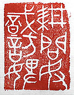 縦横・4×3cm 『宋書』沈慶之傳の一節を、金文で刻した「耕問奴織訪 婢」(耕は奴に問ひ織は婢に訪ふ)である。物事は各々 の専門家に訊ねるべきである、と言う事である。沈慶之 傳に、「國を治むるは譬ふれば家を治むるが如し、耕は 當に奴に問ふべく、織は當に婢に訪ふべし、陛下は今國 を伐たんと欲するも、白面の書生輩と之を謀る、事何ぞ 濟ふに由らんや」と有る。例え身分は低かろうとも、矢張 り「餅は餅屋」と言う事である。 |