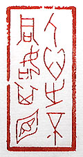 縦横・5×2.4cm 『春秋左氏傳』襄公三十一年の一句を、甲骨文で刻した 「人心之不同如其面」(人心の同じからざるは其の面の如 し)である。人の心が千差萬別なのは、其の顔が千差萬 別なのと同じである、と言う事である。三十一年には、「子 産曰く、人心の同じからざるは其の面の如し、吾當に敢て 子の面を吾が面の如くせよと謂はんやと」と有る。「人心は 面の如し」で、人の心と言うものは、將に千差萬別である。 |
