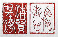 縦横・3×2.4cm 『荘子』天運篇の一句を金文で刻した、「西施捧心」(西施 心《むね》を捧《いだ》く)と、『三國志』徐邈傳の一句を戰國 篆文の回印で刻した、「清聖濁賢」とである。「西施云々」は 、何の考えも無く人の真似をすると、人々の失笑を買って 周圍から人が居なくなる事の例えである。天運篇には、「西 施心を病みて其の里に臏す、其の里の醜き人、見て之を 美とし、歸りて亦た心を捧きて其の里に臏す、其の里の富 人、之を見て堅く門を閉じて出でず、貧しき人、之を見て妻 子を挈いて之を去りて走ぐ」と有る。「清聖云々」は、酒の異 稱で所謂清酒と濁酒の事である。徐邈傳には、「平日醉客 は、酒の清む者を聖人と爲し、濁れる者を賢人と爲すと謂 ふ、邈の性は脩愼、偶々醉言するのみ」と有る。孰れにし ても、清聖だろうが濁賢だろうが、酒の美味しい季節となっ た。菊見酒から始まり、月見酒・雪見酒へと移って行く。 |