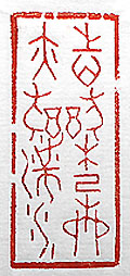 縦横・・5×2.1cm 『孟子』告子上の一節を、甲骨文で刻した「性猶杞柳亦 猶湍水」(性は猶ほ杞柳のごとく亦たほ湍水のごとし)で ある。人の性は本來定まっておらず、もともと善も悪も 無く、善悪が有るのは周圍の環境に因る、と言う事で ある。告子上には、「告子曰く、性は猶ほ杞柳のごとき なり、・・・性は猶ほ湍水のごときなり」と有る。孟子は、 この告子の「性に善不善無し」の論に對し、反論して「 性善説」を述べている。 |